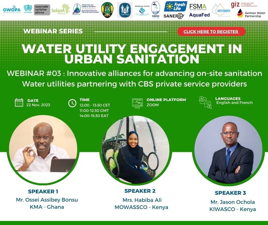 Discover how partnerships between public and private service providers can help filling the on-site sanitation service gaps, especially in low income areas. Hear first-hand experiences and valuable insights from Bonsu Assibey of Kumasi Metropolitan Assembly (KMA), Habiba Ali of Mombasa Water (MAWASSCO), and Jason Ochola of Kisumu Water & Sanitation Company Limited (KIWASCO), working closely with CBS operators such as CleanTeam and Fresh Life / The Sanergy Collaborative
